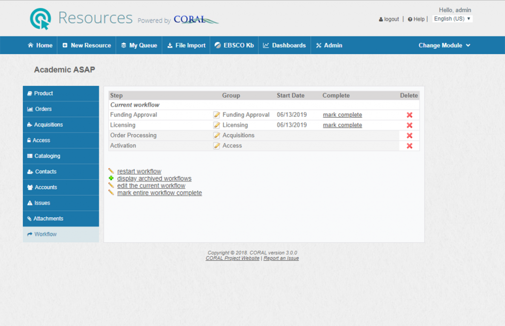 Bring clarity to electronic resources with custom workflows in CORAL. Assign a staff member to each stage, and when you complete a task, the next person in the workflow is automatically notified by email.