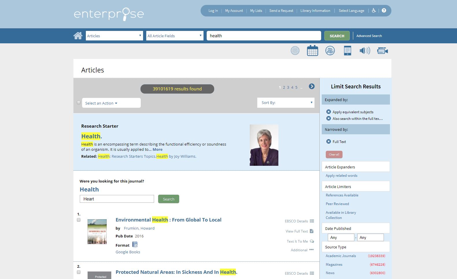 When you integrate Enterprise with EBSCO Discovery Services, your users can access full-text journal articles with one click, directly from your catalog, whether they’re on- or off-campus. And with the EDS Publication Placard, your users can search within specific journal titles without leaving Enterprise.