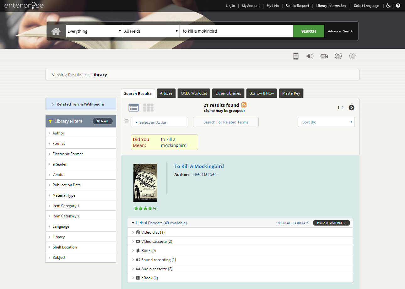 No matter your users’ search skills, Enterprise uses relevancy ranking and autocomplete suggestions to give them an interface they’re used to. From the search results, patrons can use a variety of filters—no advanced search techniques necessary.